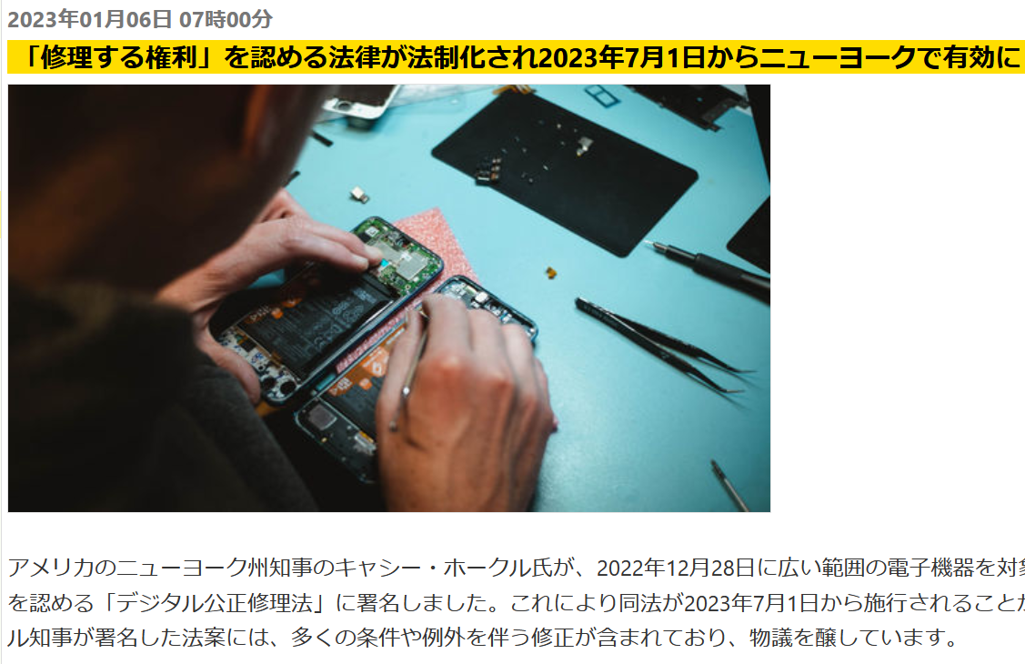 https://gigazine.net/news/20230106-new-york-repair-low/ 「修理する権利」、GIGAZINE さんが精力的に取材してきてくれています。関連する情報もぜひ御覧ください。 SHARE ICON Facebook Twitter Google+ はてなブックマーク